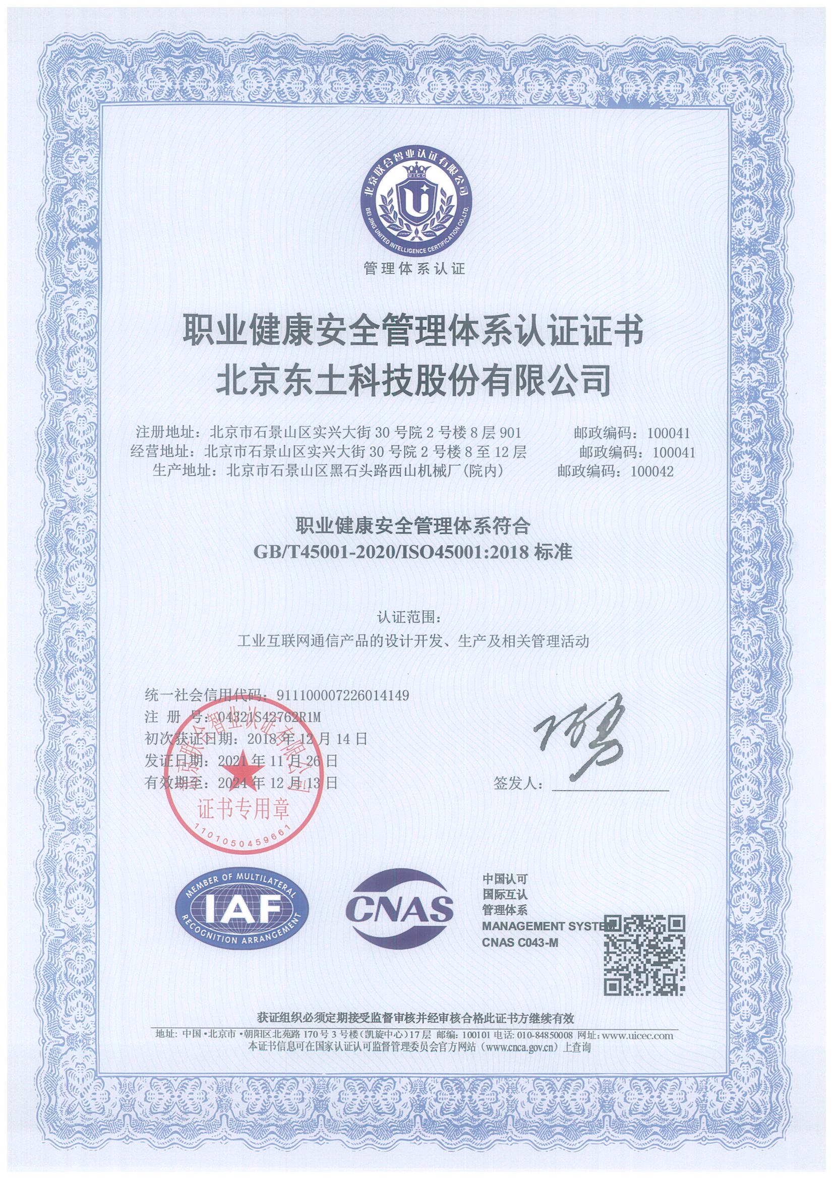 职业康健清静管理系统证书ISO45001:2018